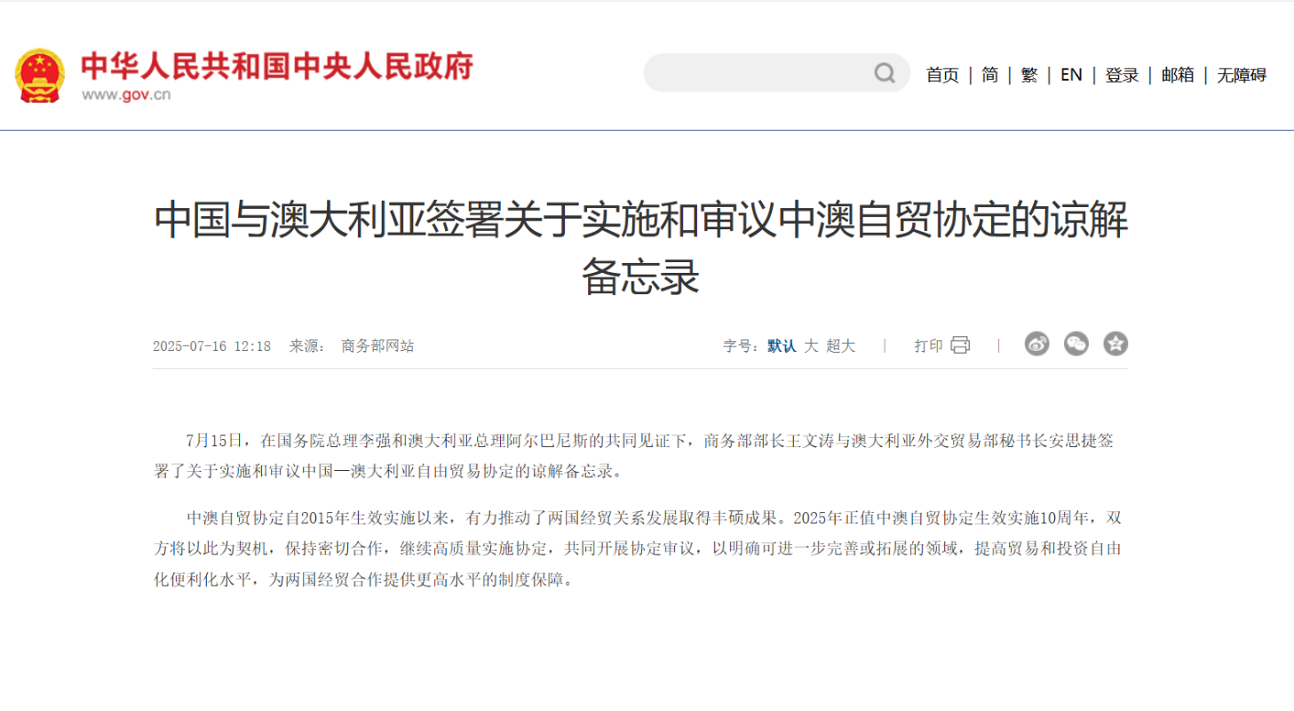 香港中通社7月16日電(香港中通社記者 吳一帆)據中國商務部16日消息,中國商務部部長王文濤與澳大利亞外交貿易部秘書長安思捷15日簽署了關於實施和審議中國—澳大利亞自由貿易協定(中澳自貿協定)的諒解備忘錄。分析指,今年正值中澳自貿協定生效實施10周年,該諒解備忘錄的簽署應是為協定升級做準備。
