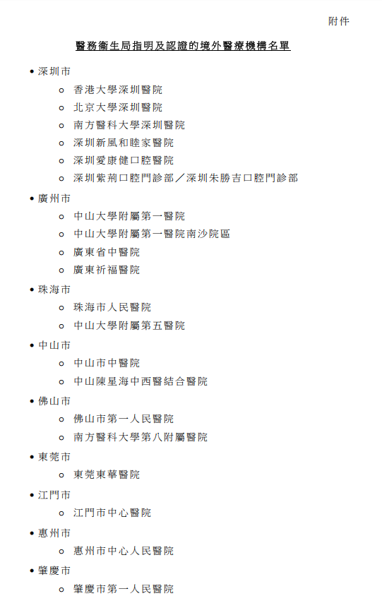醫務衞生局指明及認證的境外醫療機構包括廣州市中山大學附屬第一醫院、廣東省中醫院,以及深圳市香港大學深圳醫院、北京大學深圳醫院、深圳新風和睦家醫院等多家大型綜合醫院,亦包括深圳愛康健口腔醫院等口腔醫院。