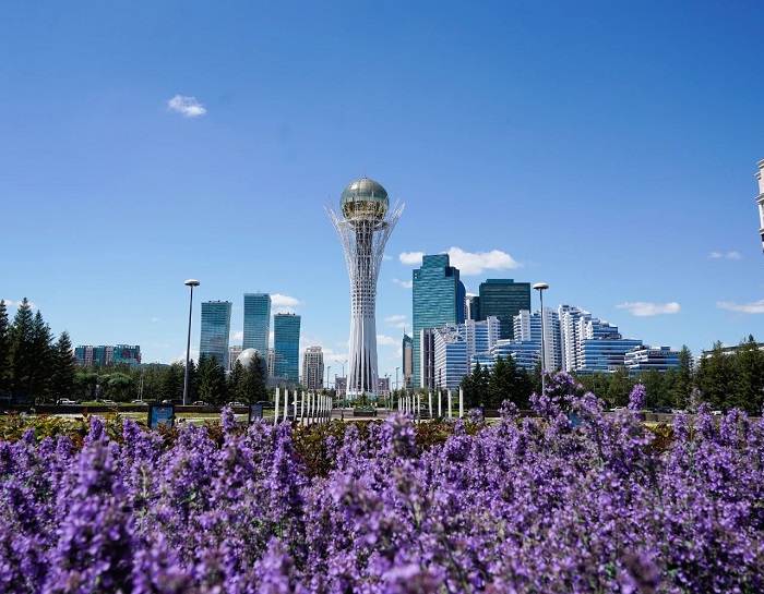 这是6月29日在哈萨克斯坦首都阿斯塔纳拍摄的巴伊杰列克观景塔。