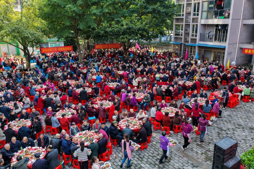 10月28日,重慶市九龍坡區華岩鎮石龍社區開展“九九重陽節 濃濃百家情”主題活動,老人們在“長壽宴”活動現場用餐(新華社圖片)