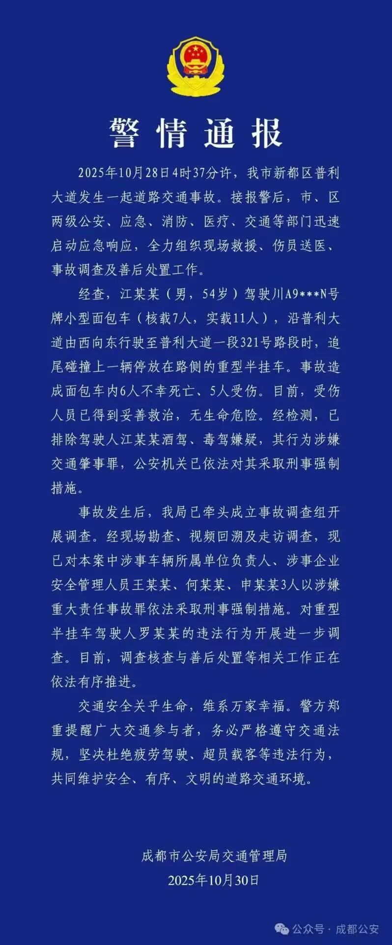 经查,江某某(男,54岁)驾驶川A9***N号牌小型面包车(核载7人,实载11人),沿普利大道由西向东行驶至普利大道一段321号路段时,追尾碰撞上一辆停放在路侧的重型半挂车。事故造成面包车内6人不幸死亡、5人受伤。目前,受伤人员已得到妥善救治,无生命危险。经检测,已排除驾驶人江某某酒驾、毒驾嫌疑,其行为涉嫌交通肇事罪,公安机关已依法对其采取刑事强制措施。