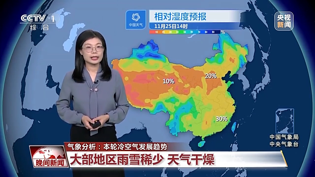 冷空气带来的雨雪并不多,而且在偏北风吹拂之下,天气会非常干燥。像是西北华北等地,午后的相对湿度可能只有20%左右,局部地区甚至不足10%,就连南方相对湿度也只有30%上下,所以整体都会是比较干燥的状态,大家要及时补充水分,并且注意用火安全。